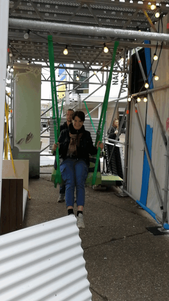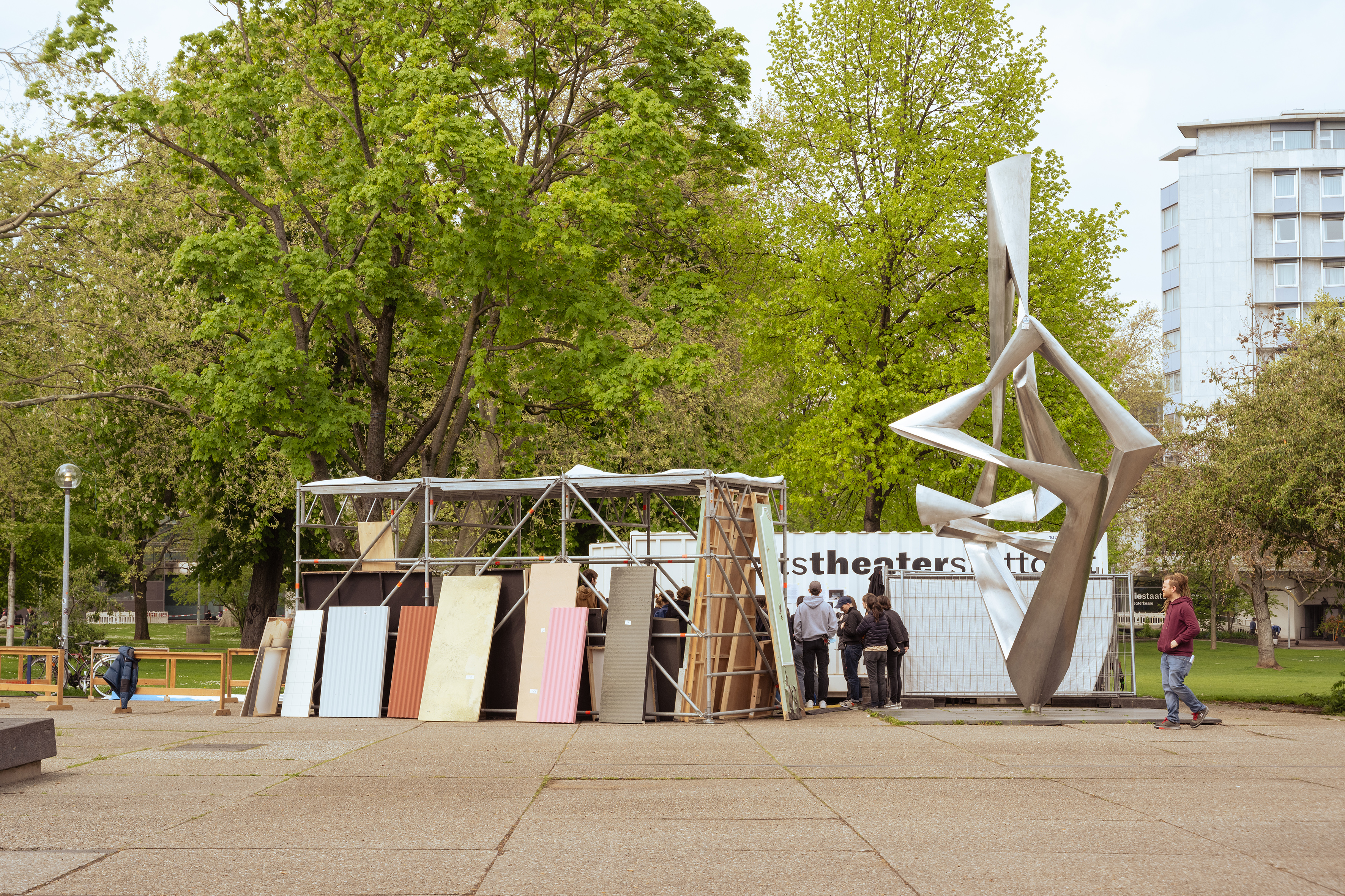 Positioned directly opposite the closed off theatre building, we encouraged casual encounters with passers-by and theatre visitors and created structures out of remains of old stage sets, open in their creation and use.